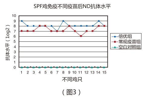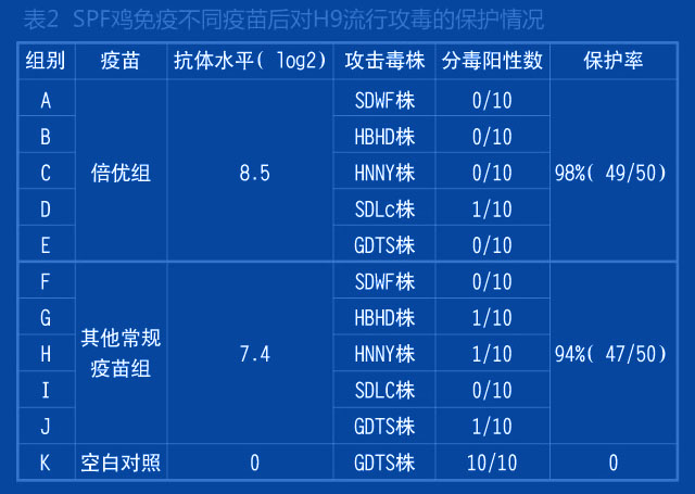在實(shí)驗室條件下,SPF雞7日齡一次免疫倍優(yōu)TM系列產(chǎn)品(ND+H9 ) 0.1ml,免疫后21天采用各地分離的流行H9毒株行攻毒,倍優(yōu)組的攻毒保 護(hù)為98% (表2)。