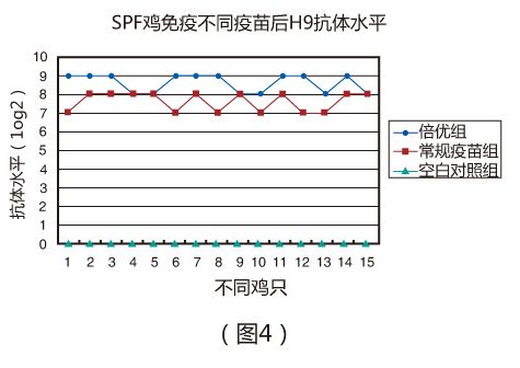 (一)在實(shí)驗室條件下,SPF雞7日齡一次免疫倍優(yōu)?系列產(chǎn)品(ND + H9 ) 0.1ml ,免疫后21天,倍優(yōu)組ND和H9抗 體分別達(dá)到8.1log2 (圖3 )和8.6log2 (圖4 );常規(guī)疫苗組ND和H9抗體分別僅為7.3log2 (圖3 )和7.6log2 (圖4)。