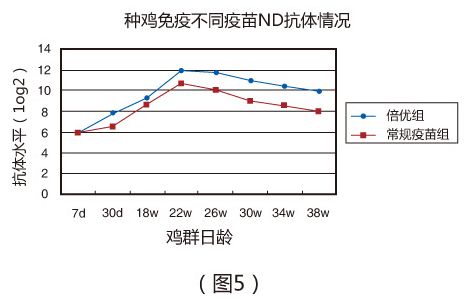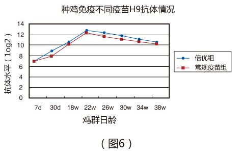 (二)在現(xiàn)場條件下,種雞分別與7日、30日和18周分別免疫倍優(yōu)TM系列產(chǎn)品(ND+H9),劑量分別為0.1ml、 0.3m和0.3ml。于22周,倍優(yōu)組ND和H9抗體分別達(dá)到12log2 (圖5 )和12.2log2 (圖6 ),且維持時間明顯優(yōu)于常規(guī)疫苗組;常規(guī)疫苗組ND和H9抗體分別僅為10.7log2 (圖5 )和11.8log2(圖6 )。