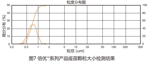 倍優(yōu)?系列產(chǎn)品每一個疫苗毒株均單獨(dú)接種雞胚,分別采毒后經(jīng)超高超微分離濃縮后再純化,高度去除雞胚尿棄液中的尿酸鹽、脂多糖等雜質(zhì),經(jīng)過高度純化和超高濃縮后,在進(jìn)行抗體復(fù)配,確保抗原成分單一,從而保證乳化后的疫苗顆粒大小適中、均勻,有效刺激機(jī)體產(chǎn)生高而待久的抗體水平;倍優(yōu)?系列產(chǎn)品疫苗顆粒大小0.5~0.6μm ,該大小顆粒占95%以上(圖7)。