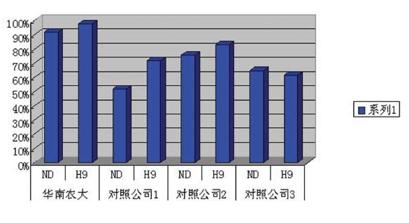 華南農業大學獸醫學院針對近年國內流行H9毒株和新城疫強毒作分析比較,挑選山東、河南、河北、廣西等 有代表性的禽流感H9N2病毒和新城疫強毒各近100株作為攻擊病毒,分別以上述病毒攻擊以用廣州市華南農大生物藥品有限公司精品系列油苗一ND+H9和國內其他廠家的疫苗免疫的試驗雞,計算發病雞數量,統計不同疫苗之間的保護率,發現廣州市華南農大生物藥品有限公司生產的精品系列油苗一ND+H9對上述攻擊野毒都有較好的保護作用。