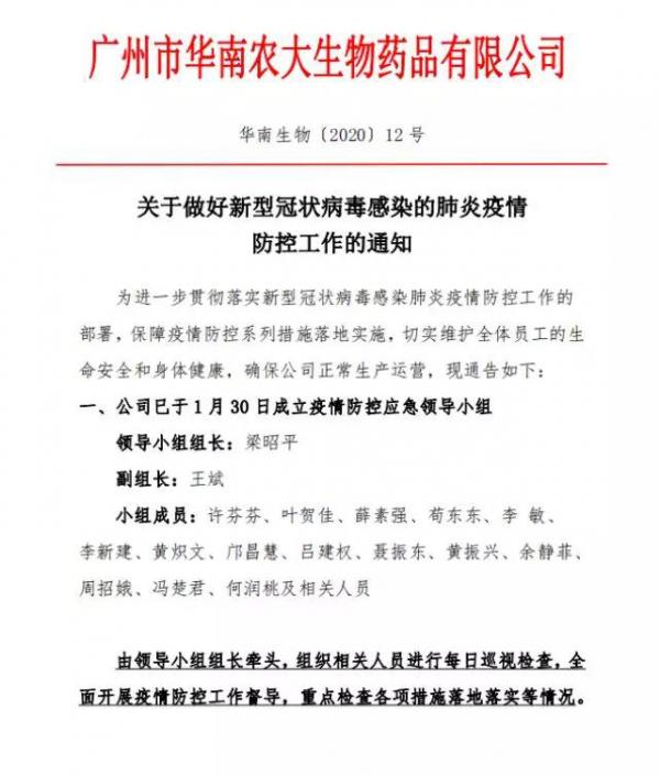 為了抗擊疫情,做好全面防范工作,公司積極響應國家號召,緊急發(fā)布落實做好新型冠狀病毒感染的肺炎疫情防控工作的通知。第一時間組成由梁昭平總經(jīng)理領導下的“華南生物疫情防控應急領導小組”及各個專項小組,全方位指導員工投入有序的防控工作當中,切實做好重大疫情疫病的防控工作。