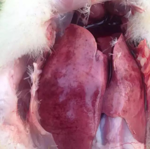 鴨肝炎病毒潛伏期一般為1~4d,突然發病,病程短促。病初表現為精神萎靡,眼半閉呈昏睡狀,羽毛松亂,翅下垂,行動呆滯,縮頸呆立,食欲不振甚至厭食、絕食;發病12~24h即出現神經癥狀,病鴨全身性抽搐、運動失調、兩腳痙攣,身體倒向一側或就地旋轉,頭向后仰呈角弓反張狀,故俗稱“背脖病”。少數病鴨死亡前排黃白色和綠色稀糞,數小時后死亡。也有的雛鴨無明顯臨床癥狀便突然死亡。 剖析可見肝臟特征性病變:肝臟腫大,質地柔軟,呈淡紅色或花斑狀,表面有出血點和出血斑,膽囊擴張,充滿膽汁。脾臟有時腫大,也呈斑駁狀。腎臟充血、腫脹,呈暗紫色樹枝狀。